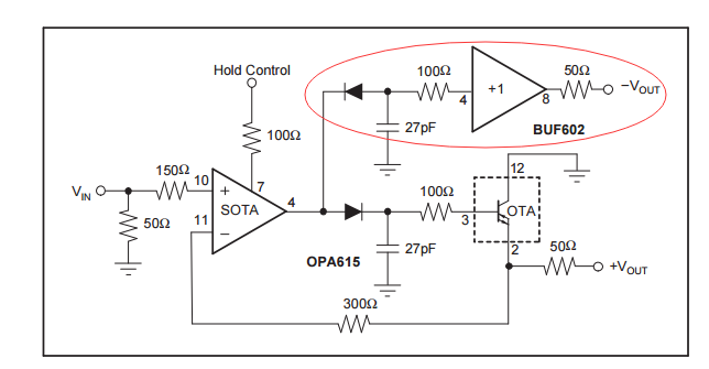 电路图如上,是手册里的图48。我只要检测负峰值,所以我的电路去掉了红色部分,其他参数都一样。接入电源后,没有接输入信号和控制信号,输出为1.35伏左右。接入1MHz 3Vpp信号和1MHz 2.6V的脉冲信号后,输出电压不变。这是为什么?
