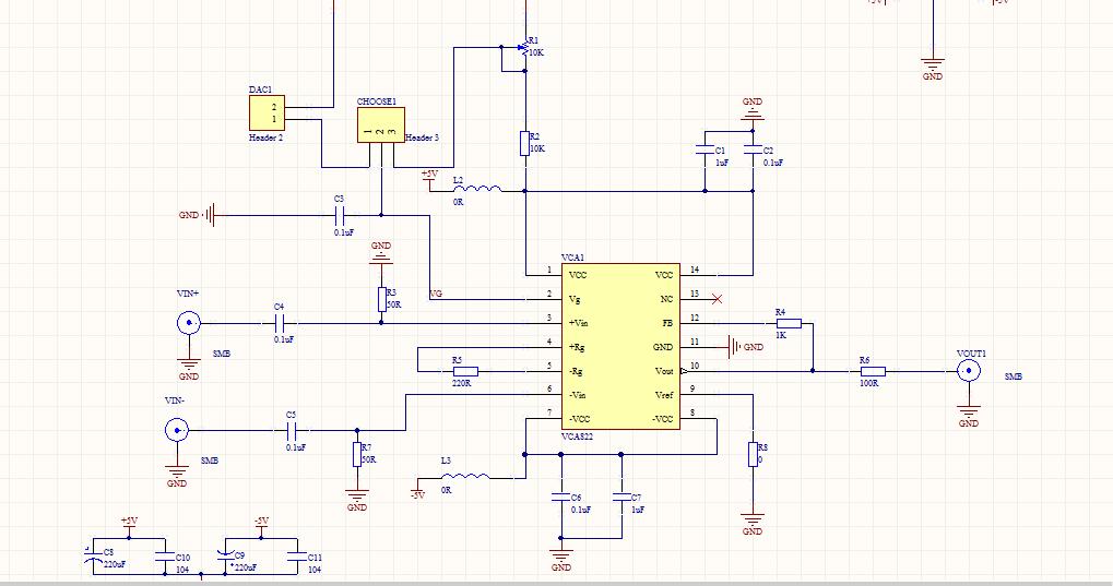 最近用VCA821 搭建了一个压控放大电路 基本是按照 官方技术手册上 搭建的,已经制作成PCB板 并焊接出来。但是测试结果为,输入端输入正弦波,输入端就变成一个4V左右的直流信号,并不是正弦波,调节Vg可以使输出的电压变小? 感觉原理图并没有问题 下面上传原理图和PCB