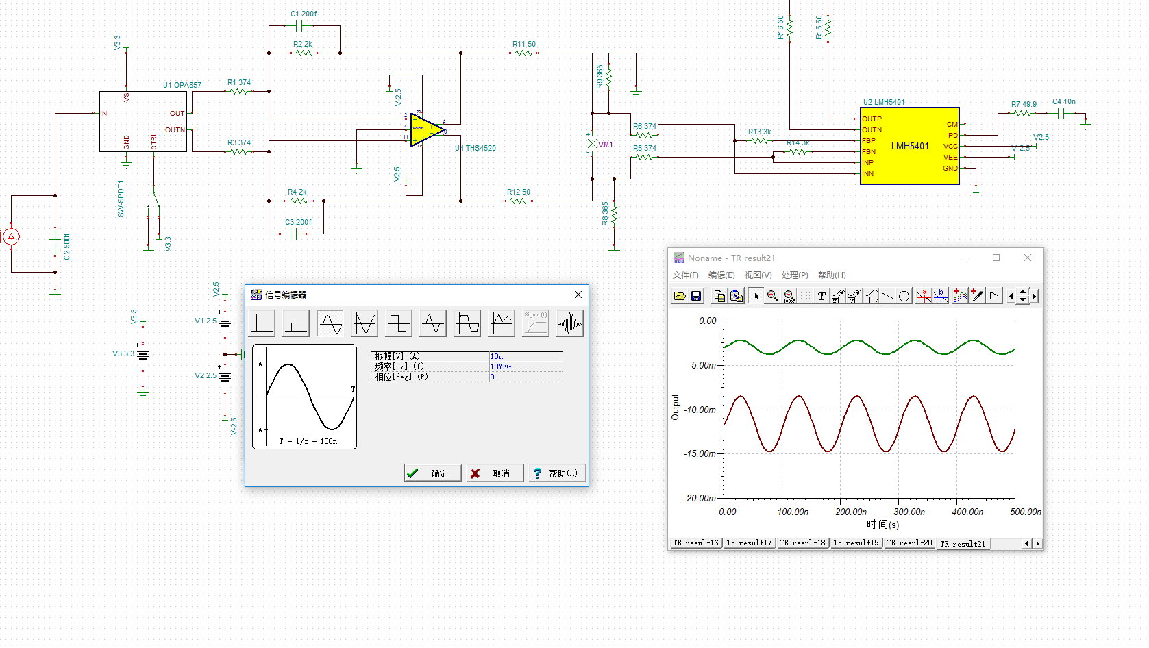 试过用OPA857来做,但是仿真发现放大其带宽达不到要求,而且在放大小于100nA的信号时,输出电压会向负电压偏移,如图