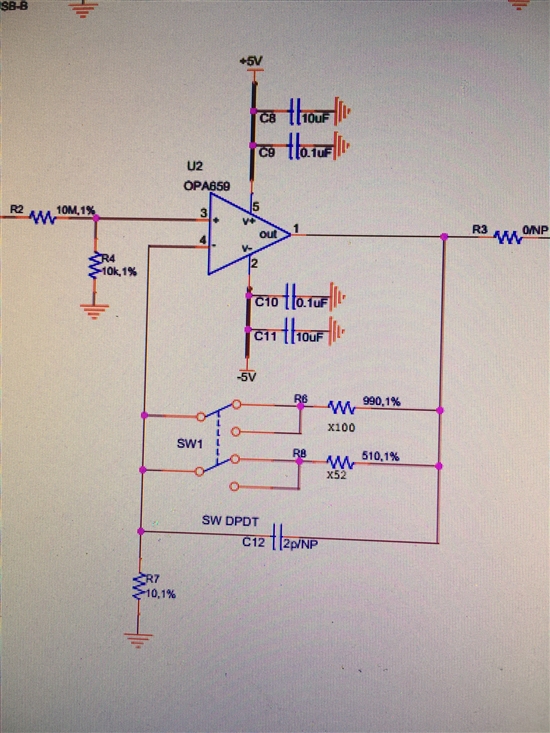 首先,输入端分压电路得到的输出就不准确,这个在OPA659输入端,所以建议先断开OPA659,看输出是否20mV。