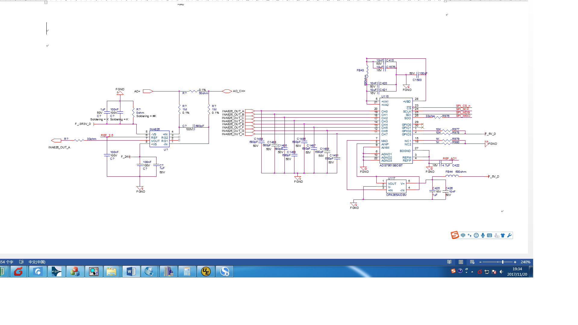 请教各位前辈,我做的一块模拟量输出板,采用ADS7951+INA826 配合完成ADC回读:AO输出电流范围为0-22mA;输出电路串联50ohm检流电阻,采用仪放INA826采集检流电阻两端电压(INA826输入正负输入端串联1M电阻,并联一个680pF电容),INA826输出串联33ohm电阻,并联680pF电容后,输入给ADS7951进行AD转换。ADS7951的MXO输出经过OPA365跟随后,送给AINP管脚。电路图如下图,画出了8个通道中一个通道的电路。