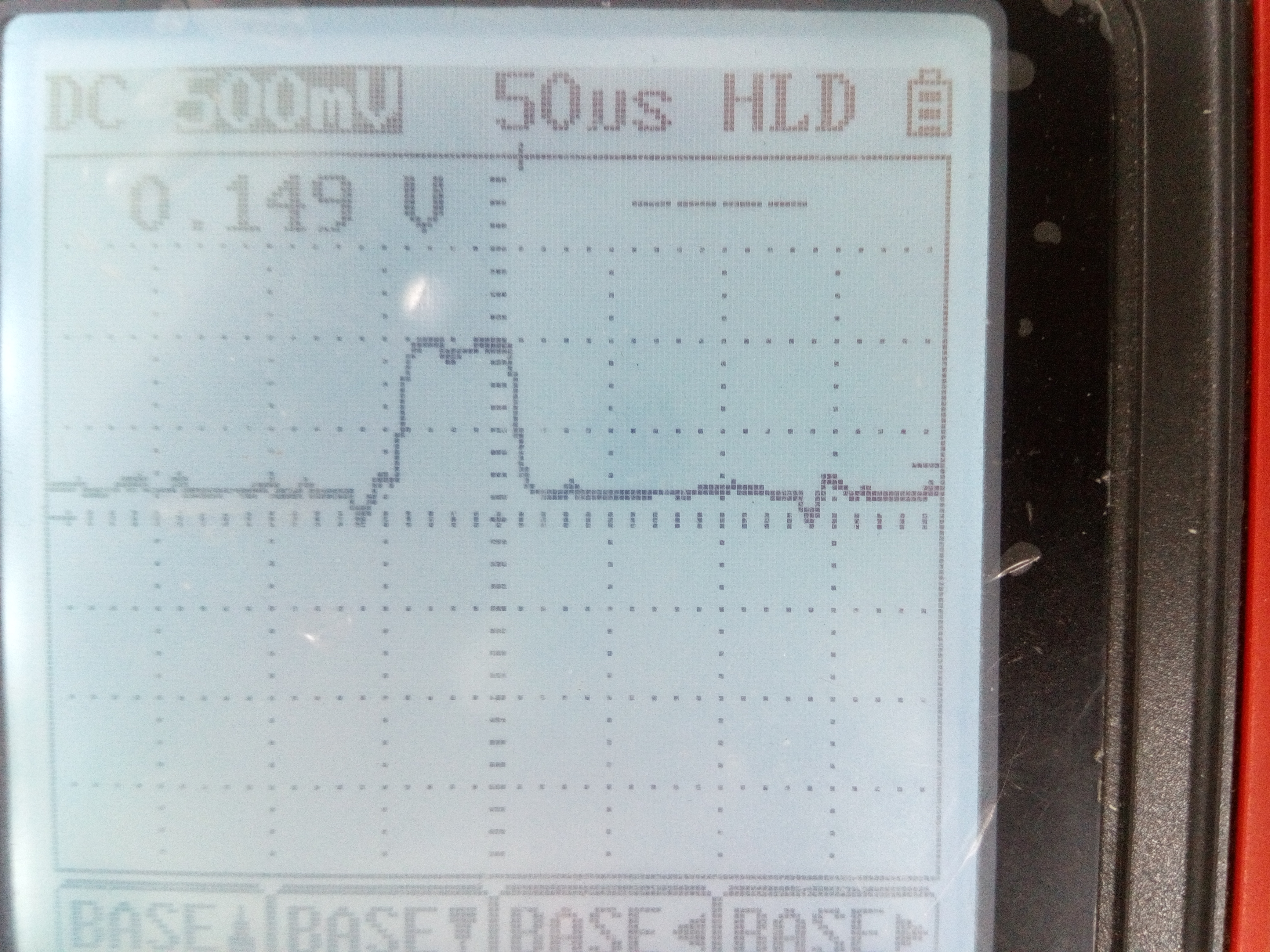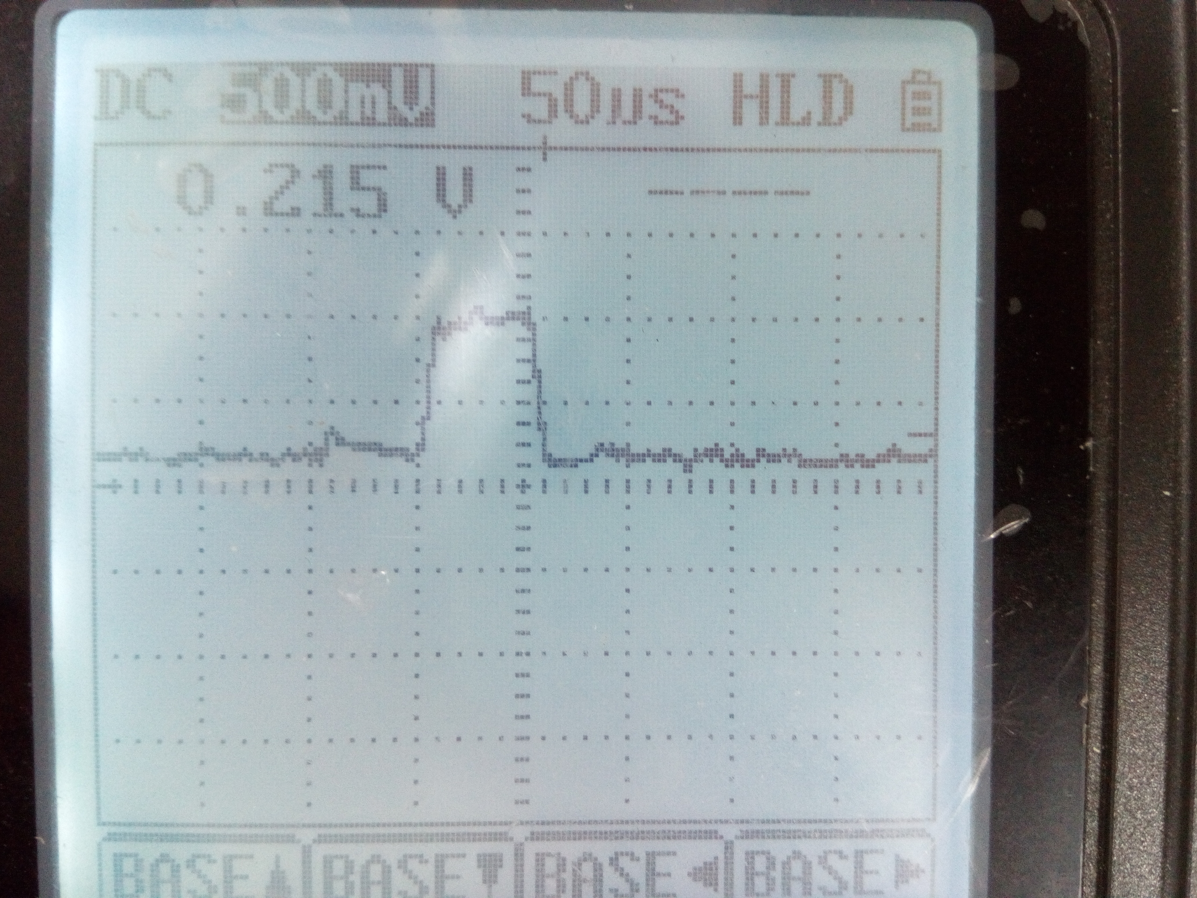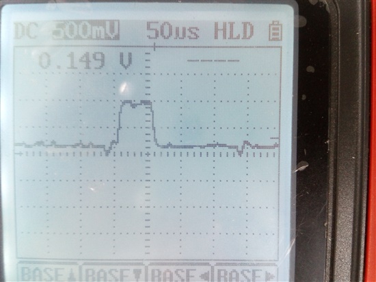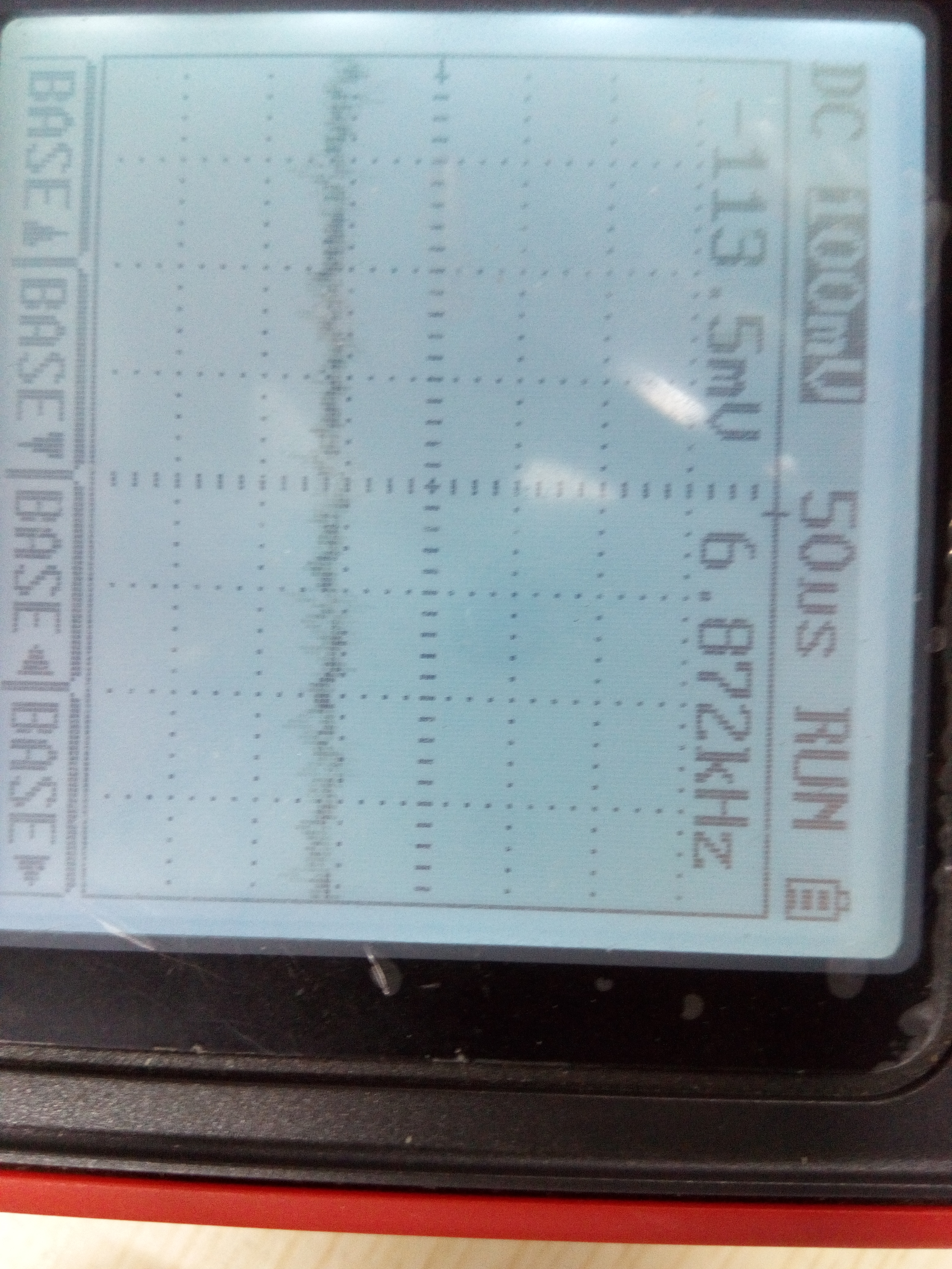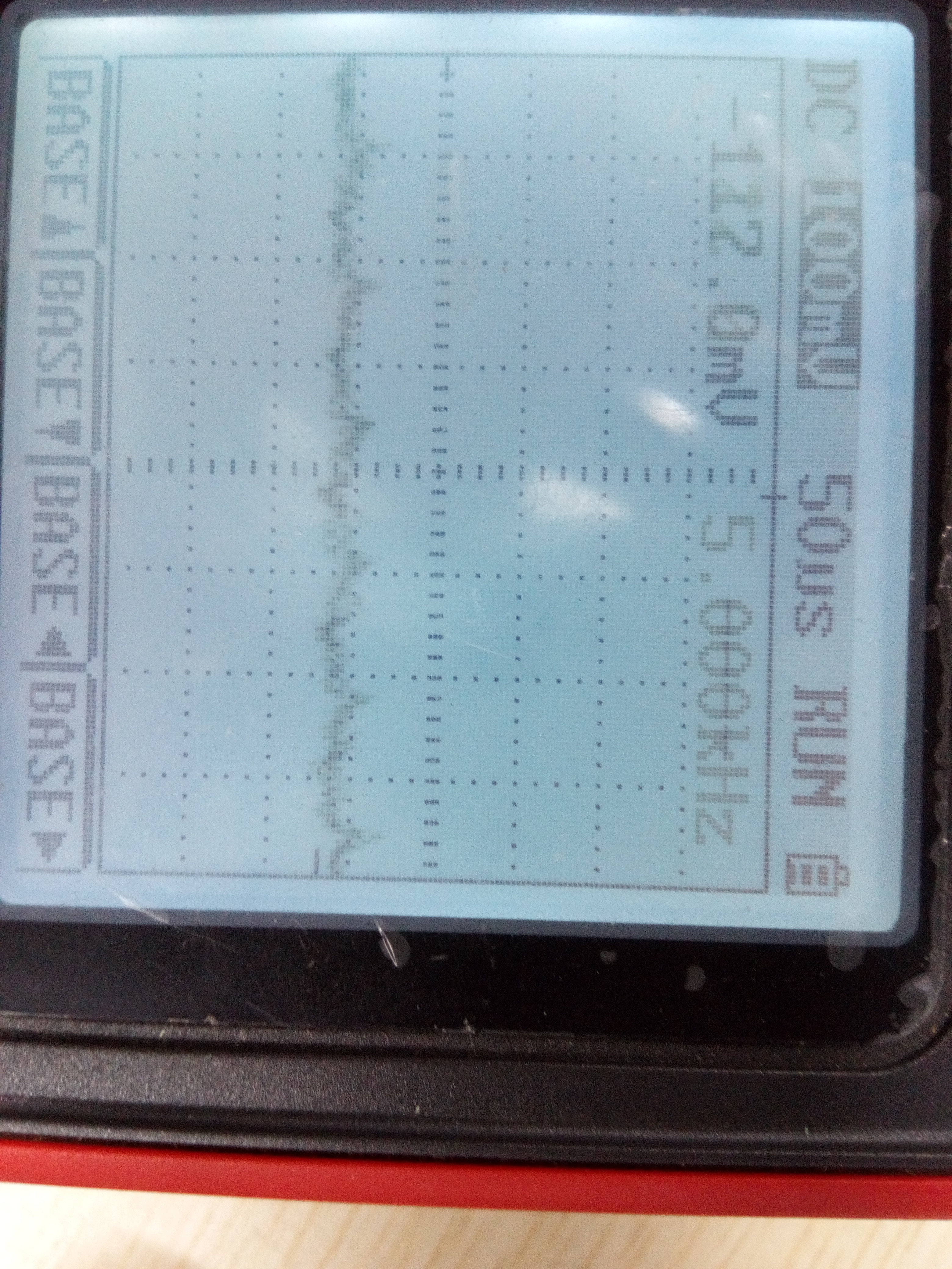 下图为漫反射下   手机随机抓拍的2张图  频率1.36KHZ    发现的问题是波形上升沿较差  并且波形底部有上下平移现象(大致在+-100mV范围内飘)