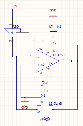 0.5pf出现的问题是  激光直射在APD上时 输出是一条直线 估计是饱和了,漫反射时会出现波形的顶部失真程一个凹槽形状  照片没拍  但应该能想象出来凹槽形状 ,还会出现的状况是改变我的脉冲波形 我的波形高电平的占空比是比较短的 但是经过跨阻转换后高电平和低电平各占一半。