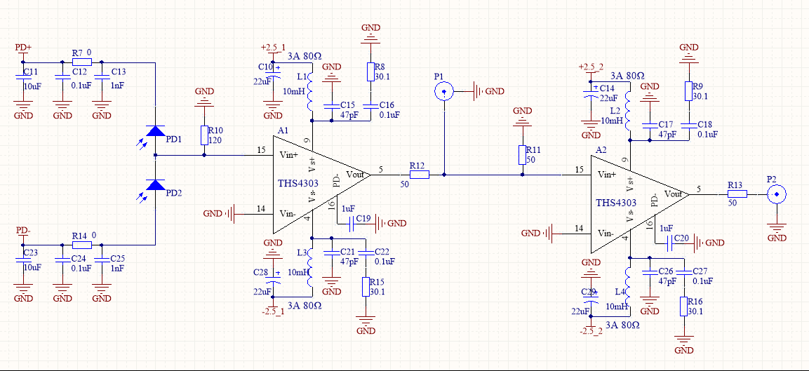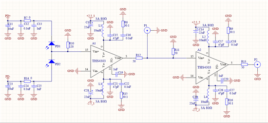 用THS4303做主放大器芯片,进行零差探测设计,电路如图: