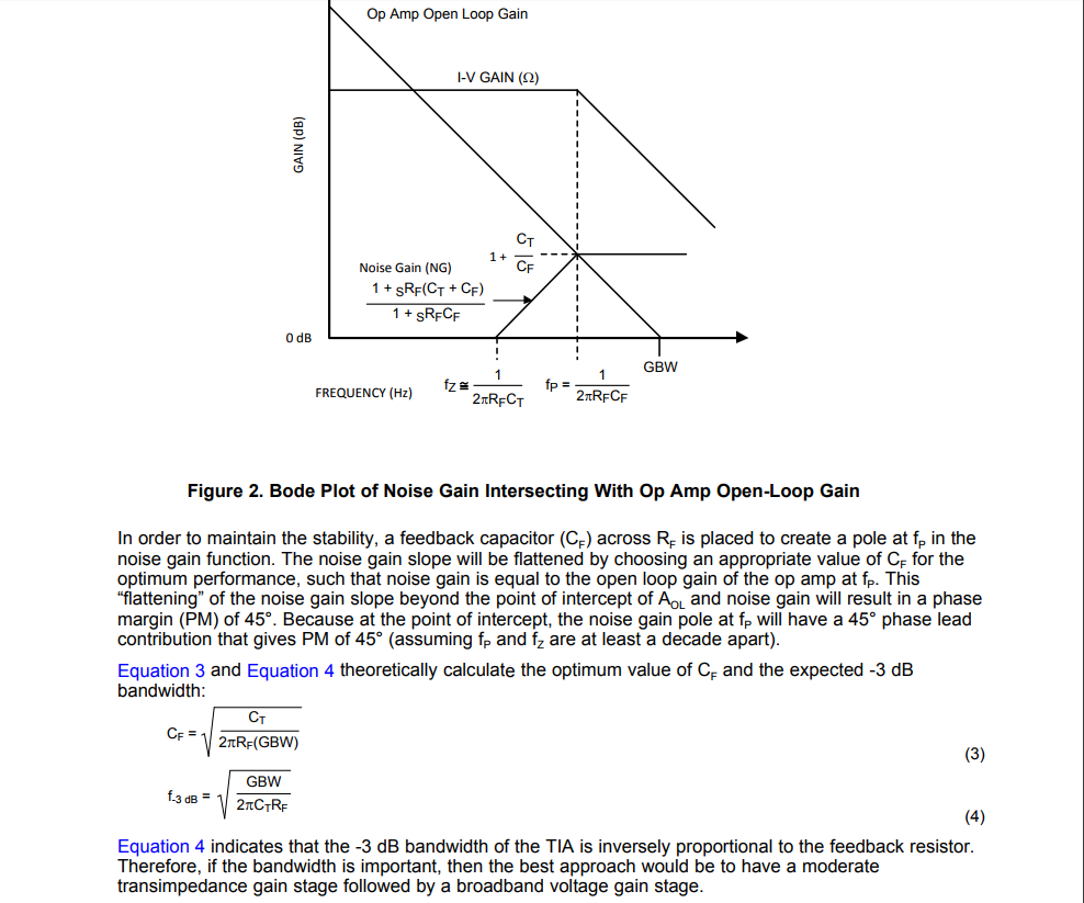 输入端的电容会有造成TIA放大器震荡的可能,在R2端并联电容可以一定程度上消除这个,电容值可以按照下面图片中CF的公式计算。CT是输入端总的电容。这个算出来大概是200fF。