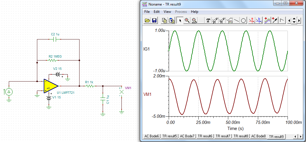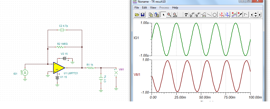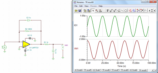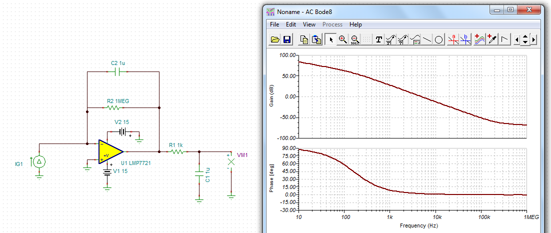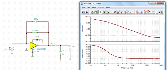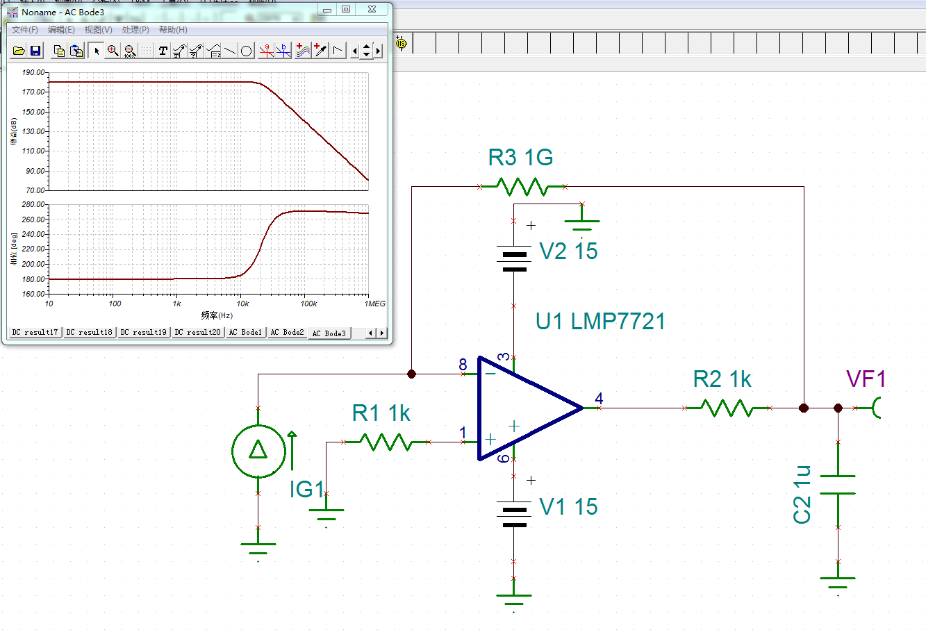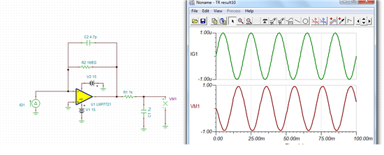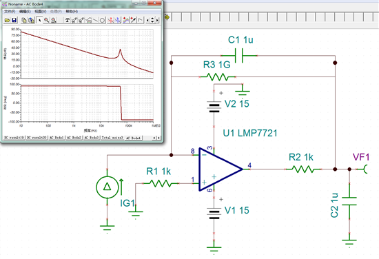 LMP7721组成的跨阻放大器仿真对比图。为什么加上电容后,反而不稳定,增益呈明显的下降趋势?