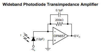 我们做了一块测量微弱光信号的板子。里面运放用的是OPA657。反馈电阻使用1M、10M以及等效电阻为100M的T型电路。在初次测试时表现很好。1M、10M档只有微安级的0输入偏置。100M档有4~8mV的0输入直流偏置(指的是0输入情况下,输出大约为4~8mV)。电路与下图雷同,反馈电阻不同。