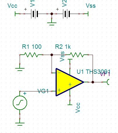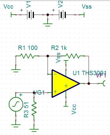如图-1用THS3091搭建一个同相放大器,由信号源提供一个峰峰值为200mV左右, 图—1