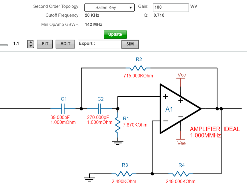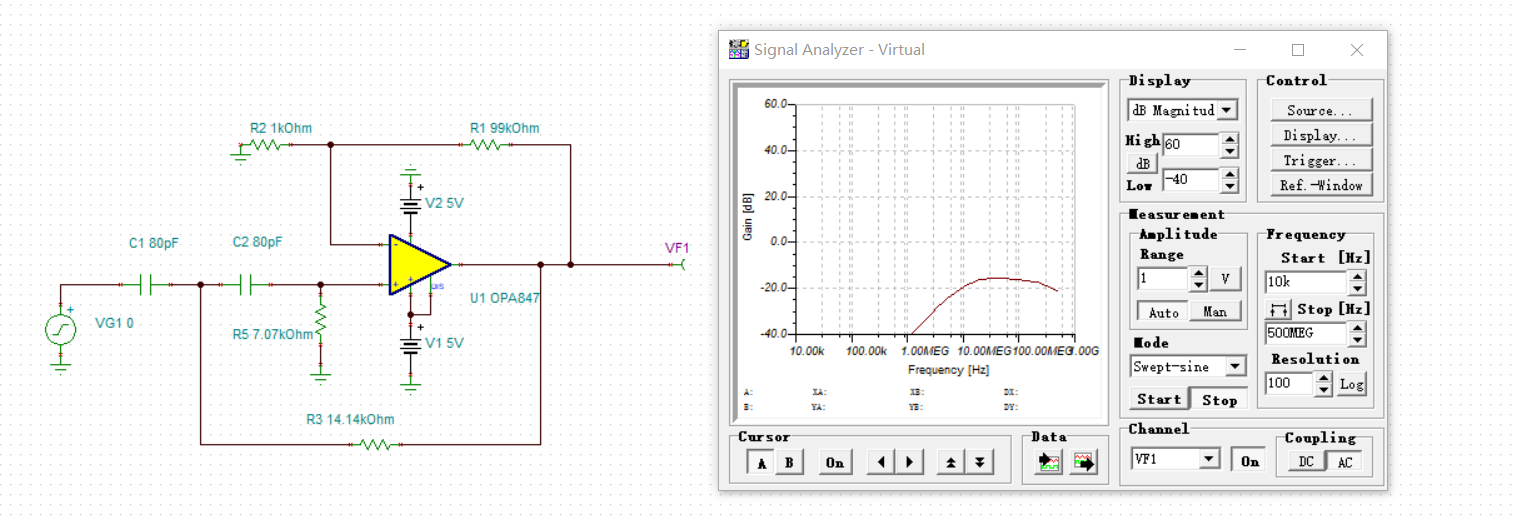 各位好,目前打算设计一款基于opa847的高通滤波器,放大倍数为40dB,截止频率为20kHz,通过书籍资料上的公式计算出的结果进行仿真,似乎达不到效果,想请问各位该如何解决?