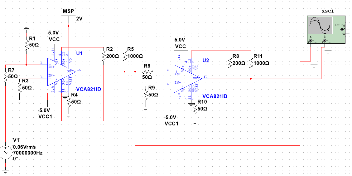 我在做2015的放大类题目,中间程控放大器选择了VCA821 ,准备用两块来串联,这个是电路