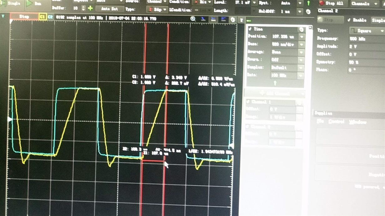 信号输入与输出用的是Analog Discovery 2,电压可能看不清,在此说明一下,电压最高点是1.67V,电压爬升时间是500ns。