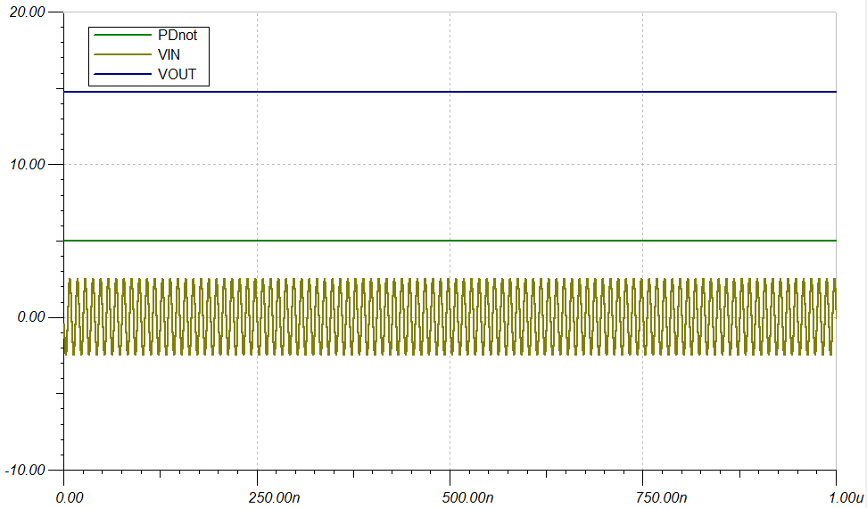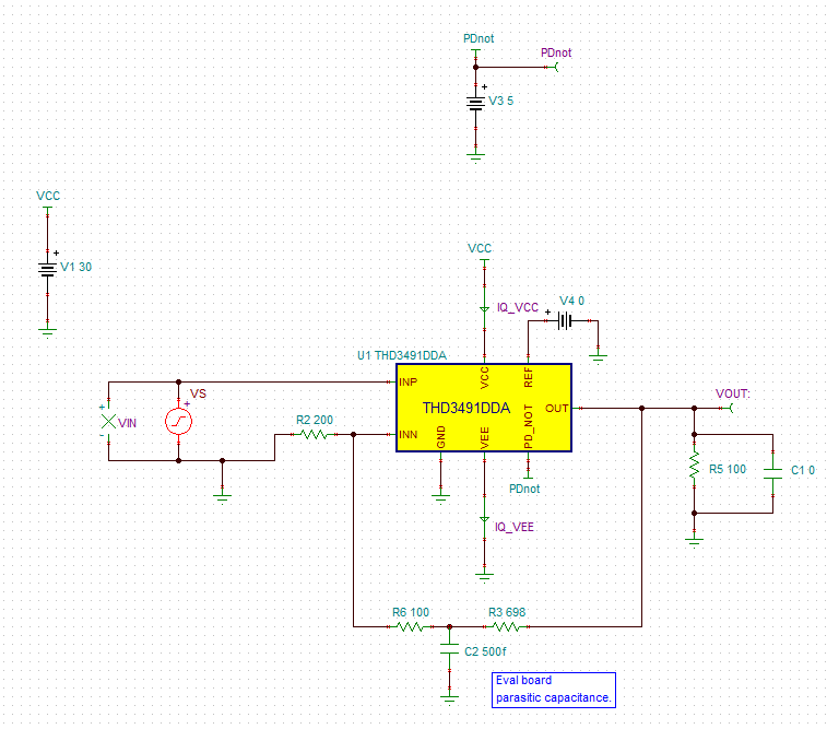 在官網載THS3491 *** 做修改,將OPA的電源訊號改成單端電源(30V),但是模擬結果沒有訊號,如圖,需要各位協助解答。
