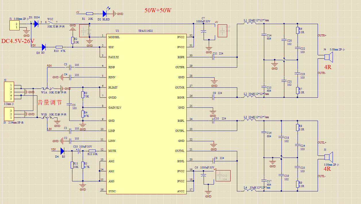 如题,开始用的耦合电容质量不好有点漏电,确实会导致砰砰声(喇叭前后吸合,一吸一弹的,一秒钟一次)换了电容就好了,重新生产一批用的是红宝石的电容故障依然出现这个问题,换电容也不行,确定是芯片烧了,换个芯片就好了。不知是不是设计问题,附图一张!