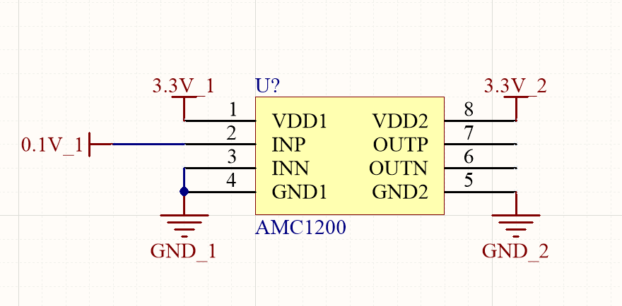 在测试时发现一个有趣的现象,刚上电时,测量AMC1200的输出,VOUTP输出3.1V左右,VOUTN输出0.1V左右,明显不正常,但是我用万用表(FLUKE 12E)点一下高压侧的一个点(任意)和低压侧的一个点(任意)之后,输出变正常了,VOUTP输出0.6V左右,VOUPN输出2.6V左右(和datasheet曲线一致),试了好几遍都是这样,不太理解。