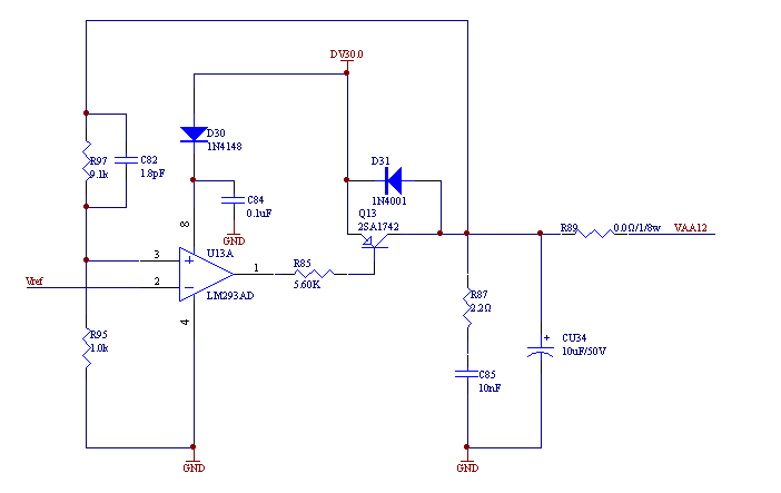 如下图,通过运放lm293和晶体管2sa1742组成可调稳压电源,设定电压VAA12=23V,在VAA12处接上负载,输出的电压VAA12一直稳定为23V,当晶体管2sa1742发烫后,如果负载不撤掉,电压VAA12也一直稳定,但是如果此时把负载突然撤掉,整个控制失控一样,VAA12的电压变得和DV30.0一样,重新接上负载,电压还是可以调到设定的23V,搞了几天了,查不到原因,请各位专家分析下。谢谢