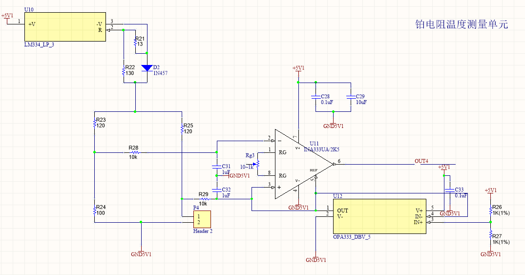 下图是我设计的电路图,对INA333采用单电源供电,为了给INA333提供一个2.5V的共模电压采取了以下接法,经过调试后发现输出为零。不知道是不是电路图设计错误还是其他的原因,请大家帮忙解决一下这个问题,最好能提出电路的修改意见,万分感激!谢谢