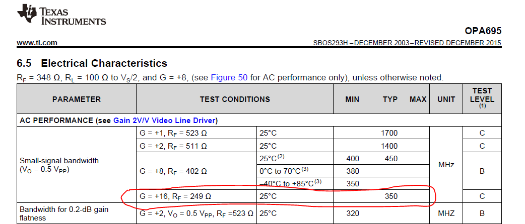 2、数据手册给出的参数:带宽350MHz