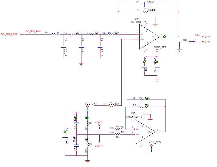 这是一个DC自动光圈的电路图,drv+/- 和cont+/-分别接了一个线圈,这两个线圈相互抵抗,控制光圈维持在某个大小,drv是驱动线圈,count是阻尼线圈,通过pwm的占空比,就能调整光圈的开合,目前3.3v控制不了(drv最大能到1.8v),需要调到4V才能控制(drv最大到2.5v),实际测试光圈也是需要2.5v左右才能动作。