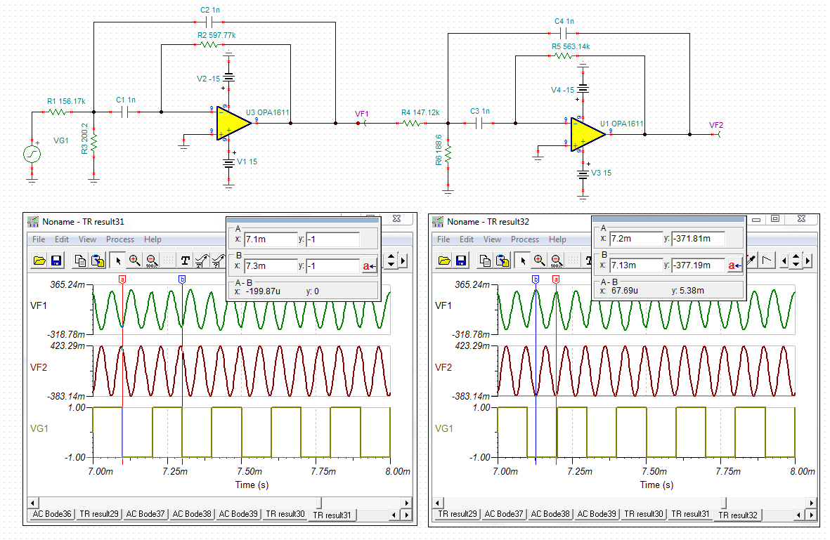 建议使用四阶MFB 带通滤波器试试。这个电路中运放的增益带宽积大约40MHz左右。能将3次谐波提取出来。信号源是5kHz,2Vpp。不过这个电路的增益似乎还是有点问题。