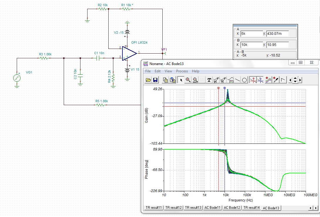 对于二阶Sallen-Key带通滤波器来说,G=1+R1/R2,Fm处的增益Am=G/(3-G),当R1约等于R2的两倍的时候,就会出现G趋近于3,这时候电路很容易不稳定,产生振荡。下图是R1取值16k-20k的增益变化。而且这个滤波器在5kHz和10kHz处的增益也比较大,它的边沿不够陡峭,无法有效滤除其他谐波。