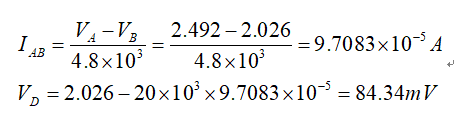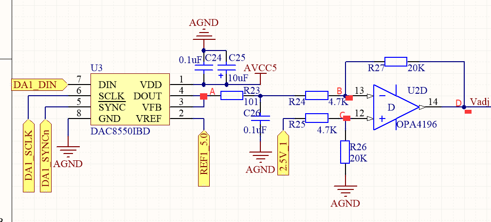 DAC输出(A点)电压为:2.492V; 运放OPA4196反相端(B点)电压为2.026V;运放OPA4196同相端(C点)电压为2.025V;运放OPA4196输出端(D点)电压为90.4mV?;