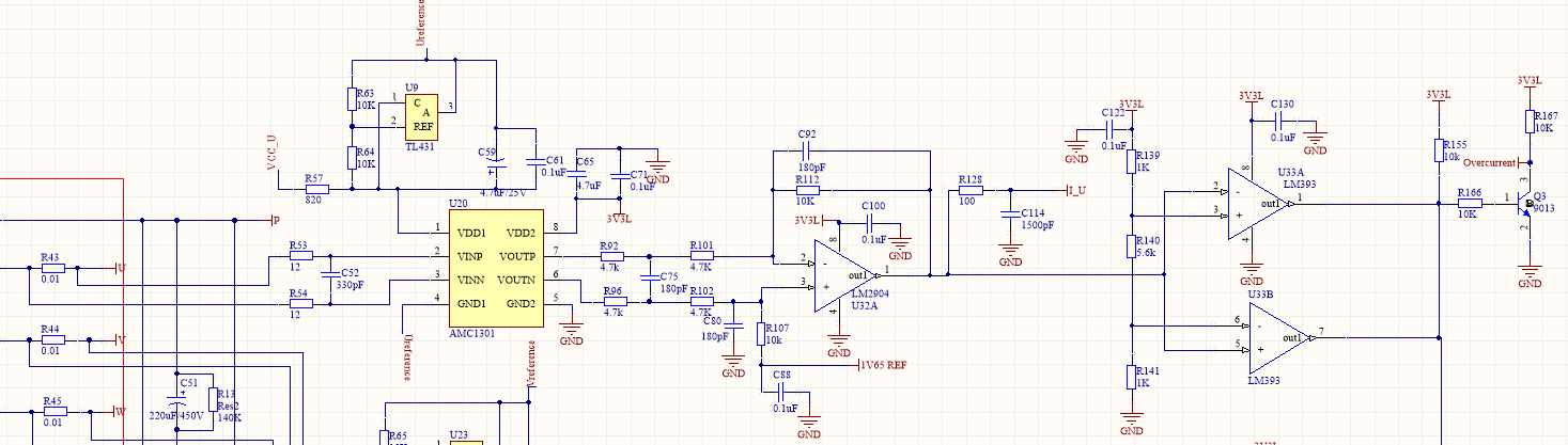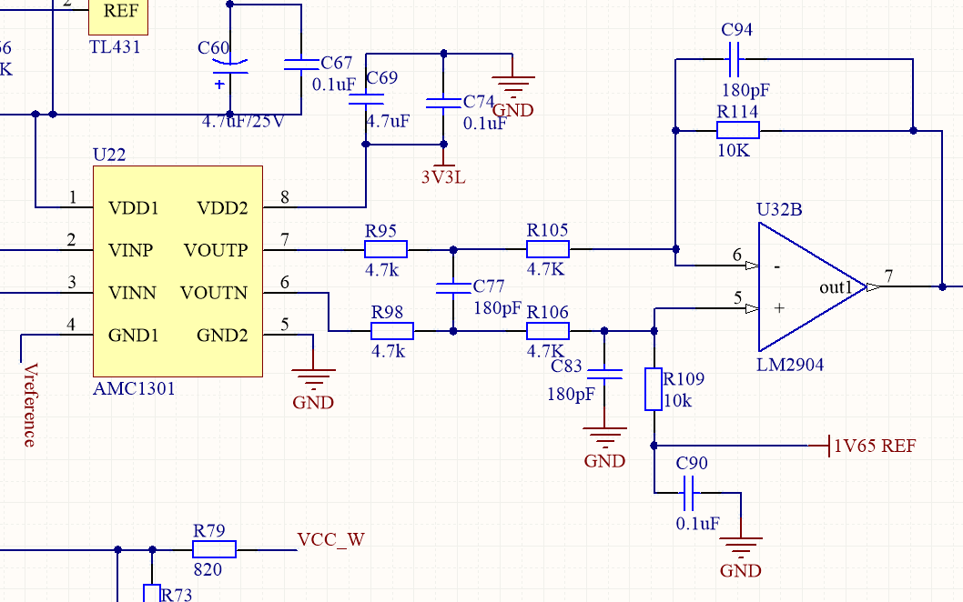 图为交流电流的采样,过电流保护,图中LM2904的同相和反相电压值怎么算,是不是根据AMC1301的6,7脚电压才能得出放大器的输出电压,LM2904输出电压怎么算?