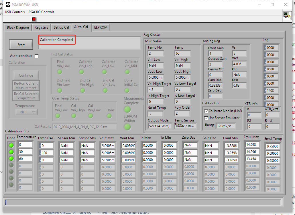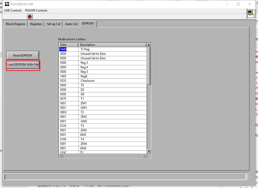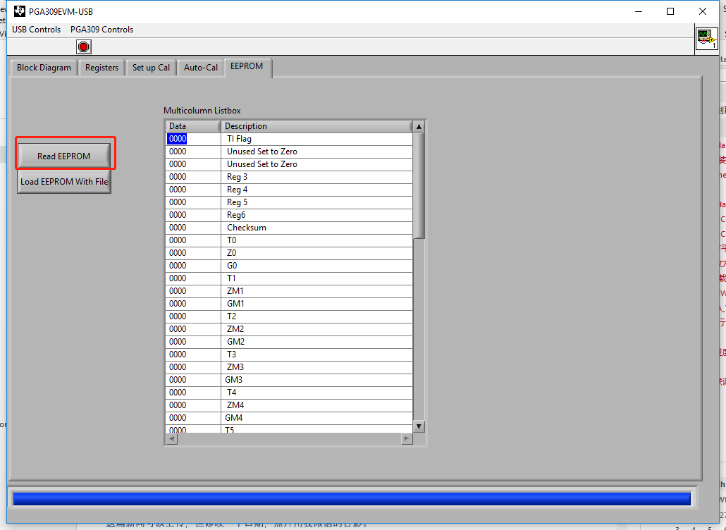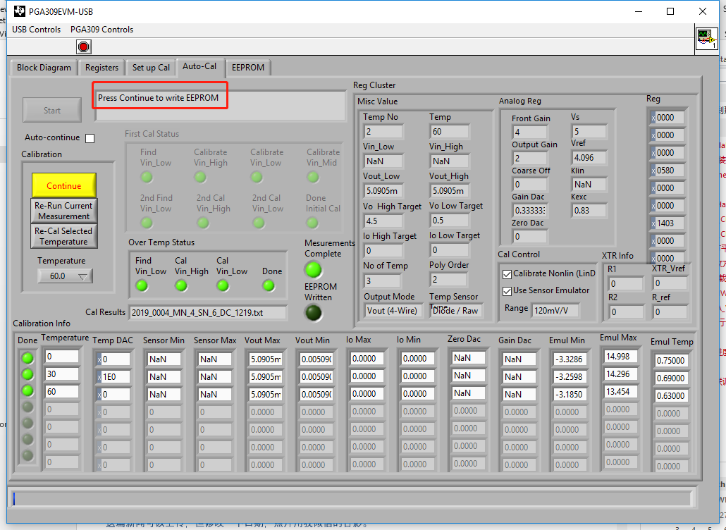 使用PGA309EVM-USB评估板及其配套软件模拟校正测试后,按 continue 写入EEPROM后,可以打开cal results 文件,里面的EEPROM都有数据,但是去软件的EEPROM页签,按 read EEPROM按钮后读取到的数据为什么都是0 呢?