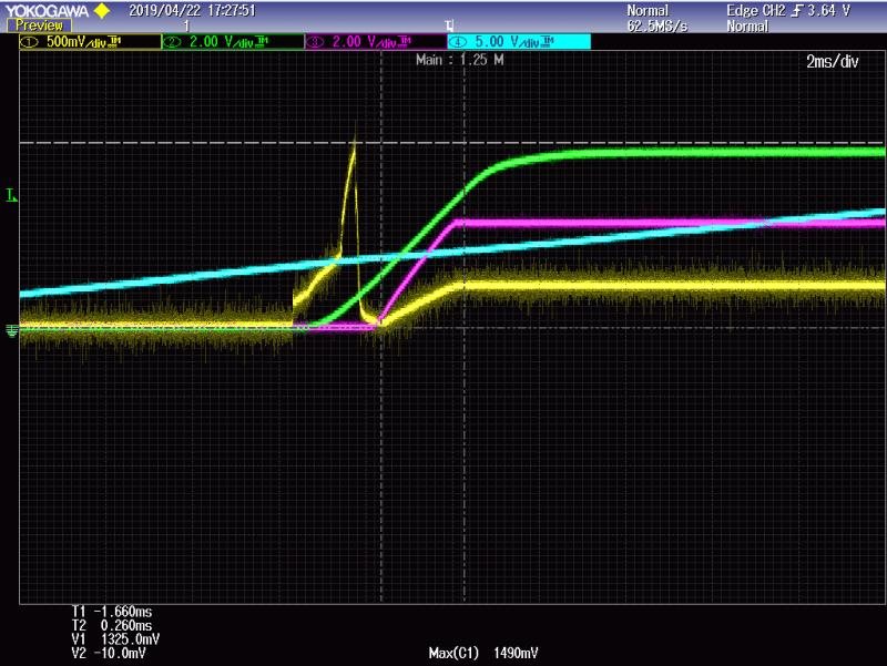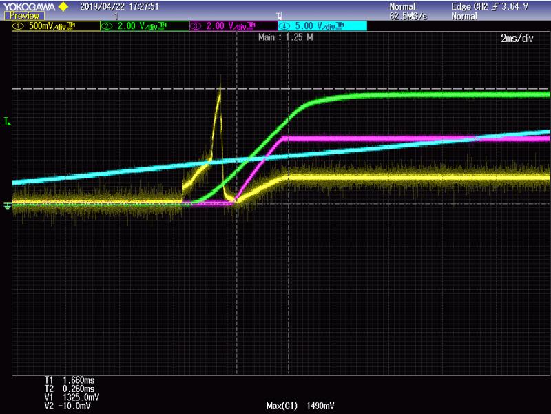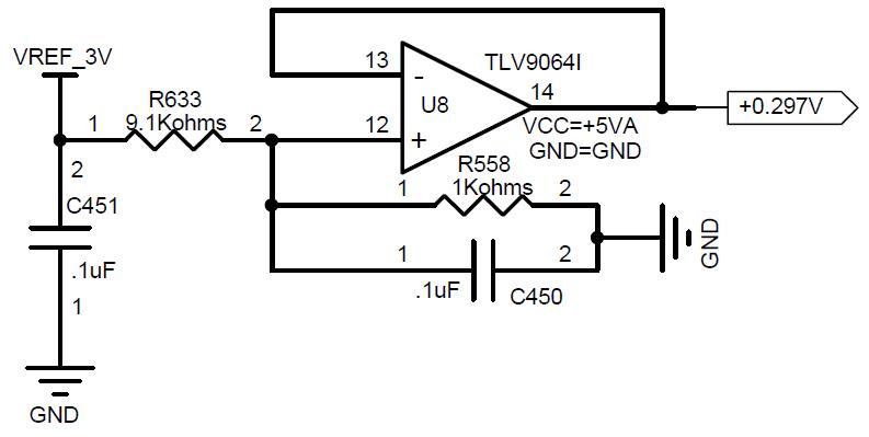 客户在使用运放TLV9064的电路如下,按照设计规格输出为0.297V,但在上电时会过冲到1.3V,严重超过设计标准,请教是什么原因造成的,该如何修正。谢谢!