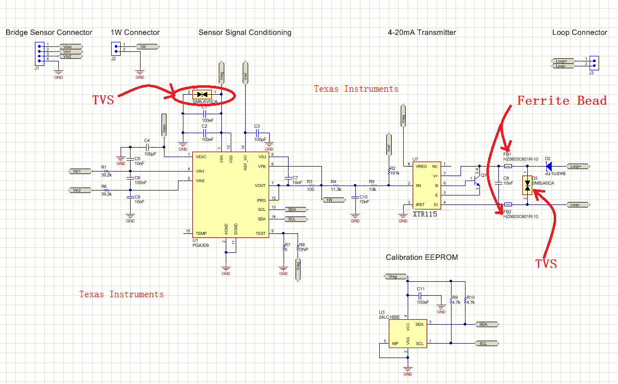 由于桥式电路压力传感器耐电压较小,交流电压有可能通过电流输出端子、XTR115、PGA309作用到桥式电路压力传感器,导致压力传感器损坏。