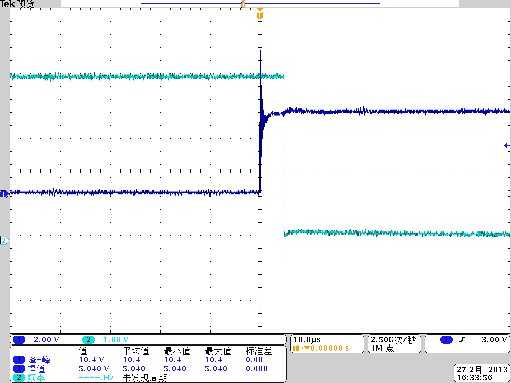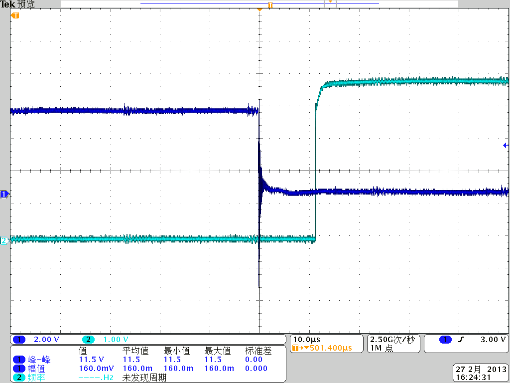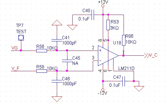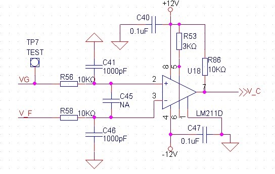 请教以下问题,参看原理图,VG是给定电压值,V_F是采样电压,V_C是输出电平,实验中将VG给定一固定电压值,给V_F一个脉冲电压,观测V_C电平变化,观测V_C响应时间; 参看波形图,蓝色信号为V_F输入脉冲电压,绿色信号为V_C输出电平信号,观测响应时间长达10us,数据手册上说LM211响应时间只有200ns左右,差距比较大,不知道是什么原因?