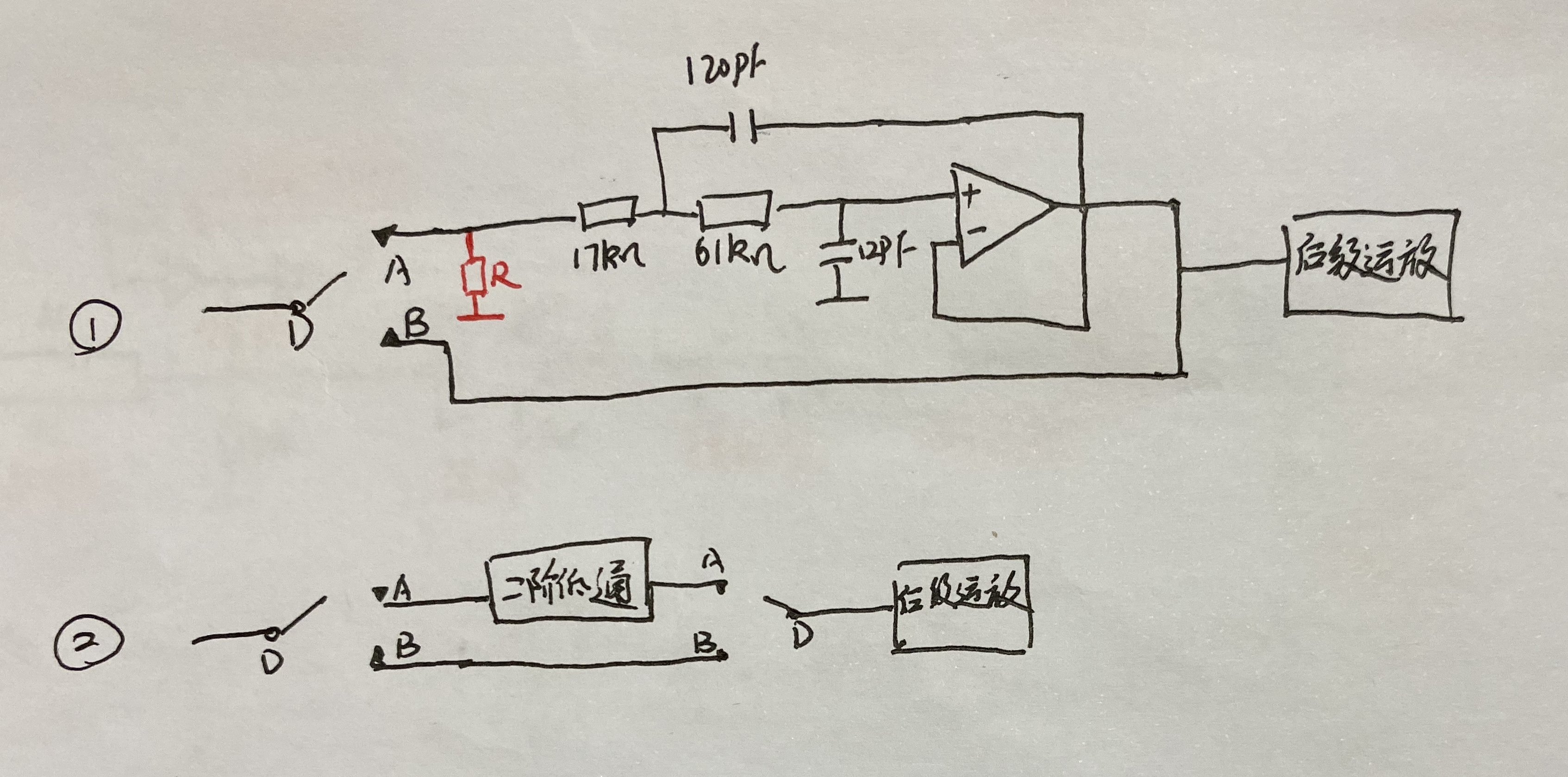 所以,首先我想在第一个方案中加一个下拉电阻,使得滤波的输入电平是确定值0,输出的干扰会小一点,然后更保险的做法我考虑在滤波之后再加一个模拟开关,也就是第二个方案,这样AB通路之间的干扰是不是就会少了很多?