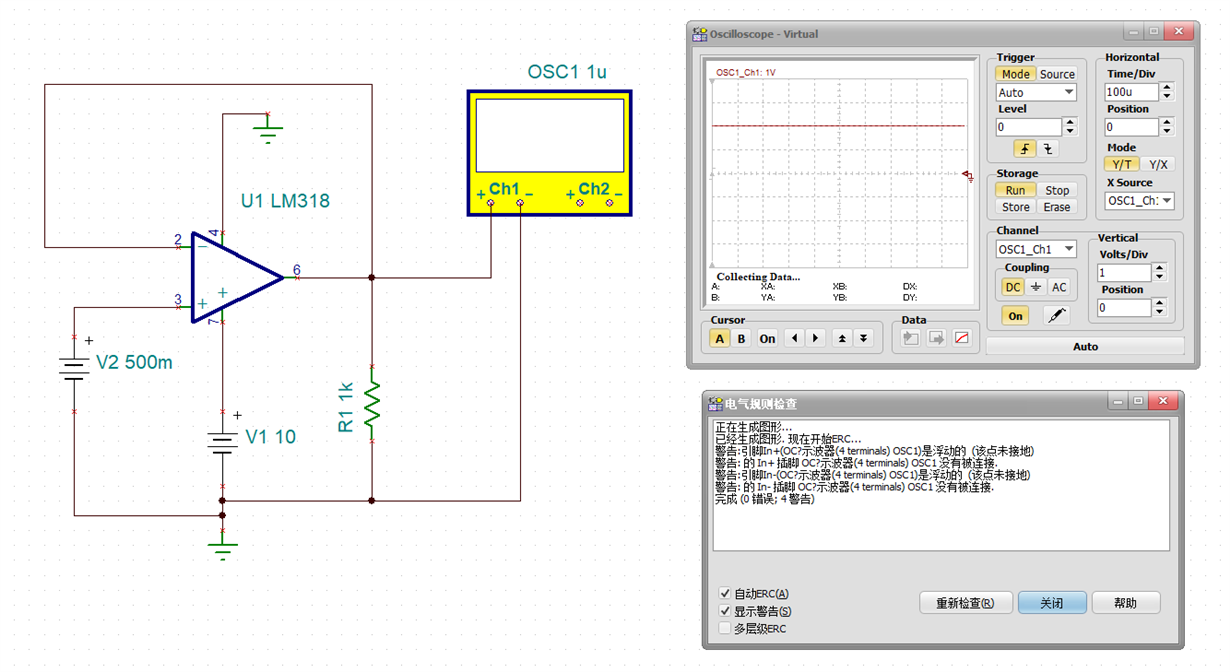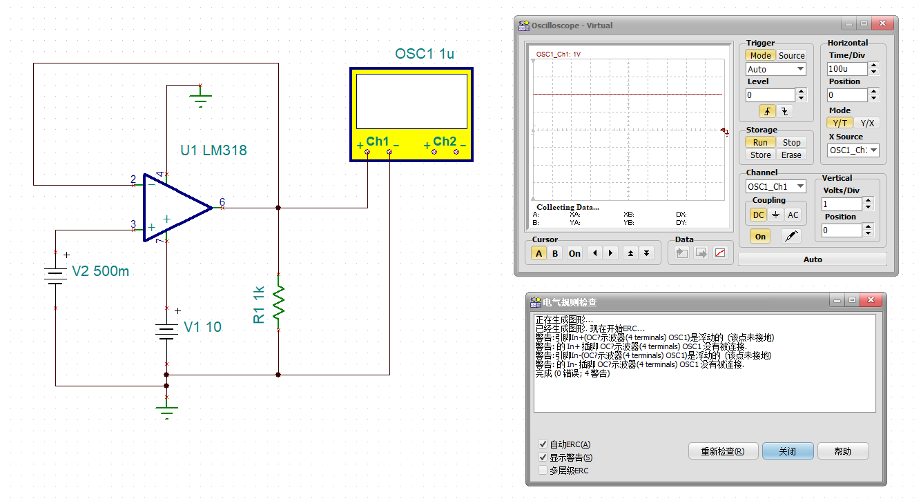 下图是LM318的仿真图,在单电源10V供电时的输入共模电压范围 应为3.5V-6.5V,输出电压范围2V-8V,但是输入0.5V时,输出的低电平为2V,与 数据表对应