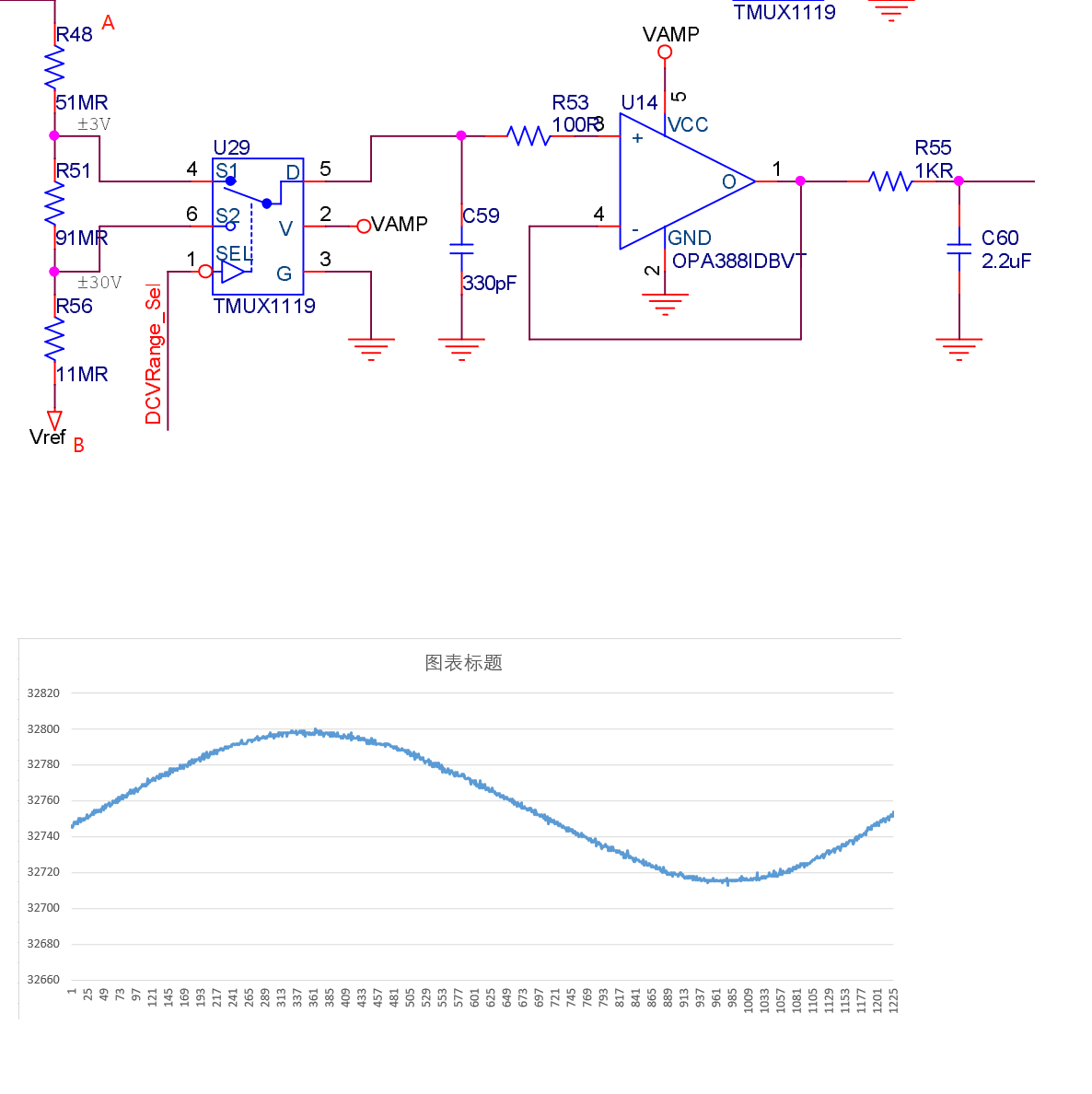 最近在做一个项目,需要采集满量程为±30V 左右的高内阻直流电压,电路如下,信号的一极直接接系统的参考重点REF2V5 ,另外以及通过电阻分压后利用OPA388做缓冲,然后送入一个16位ADC进行采样转换。