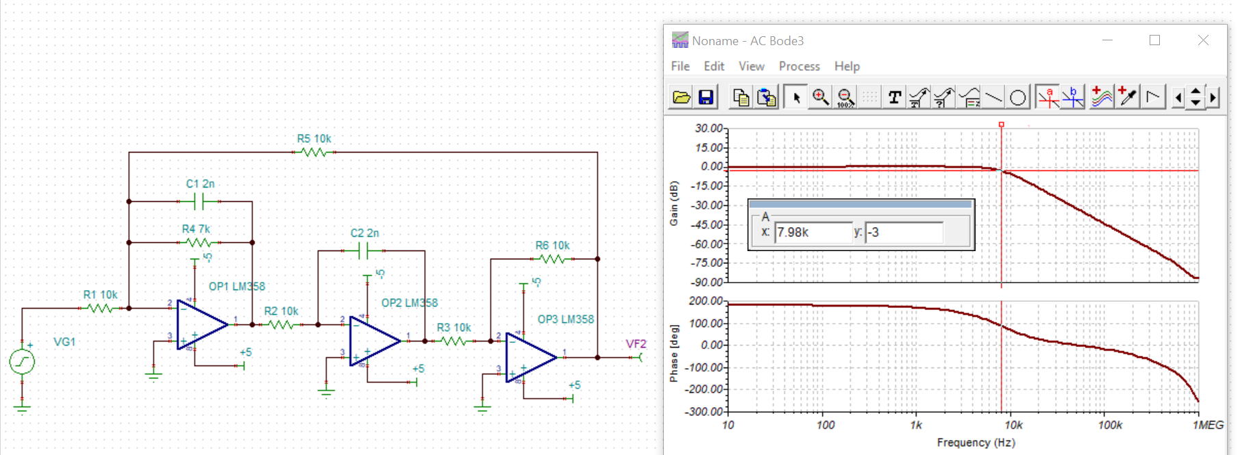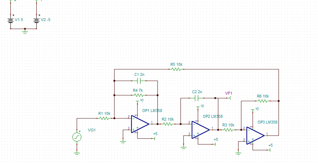 这是我的 低通滤波器的电路图   双电源供电   芯片采用的是LM358芯片    设置的截止频率是10khz
