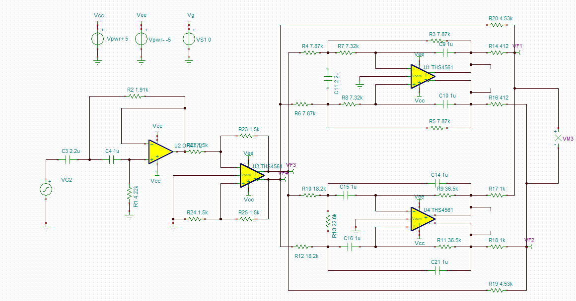 这是一个单端输入的高通滤波器转差分输出,然后该差分输出作为频率补偿电路的输入,U1是一个全差分低通滤波器,U4是一个全差分带通滤波器,整个电路实现的功能是将一个截止频率为38Hz的单端输入高通滤波器转化为截止频率为10Hz的差分输出高通滤波器,然后在实际电路图测试当中,VM3两端的直流电压为35mV左右,导致输出的波形不理想,请问是什么原因导致的差分输出两端有35mV的直流偏置电压呢,怎么样才能将该偏置电压控制到1mV以下呢,请求帮忙解答一下,谢谢!