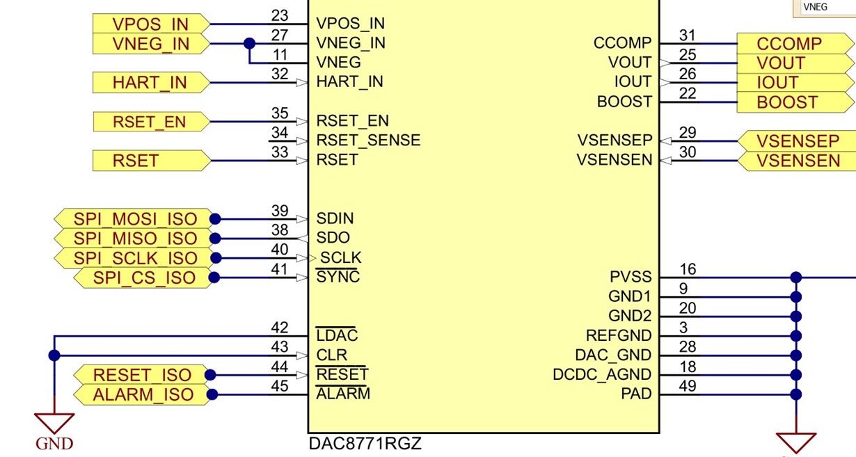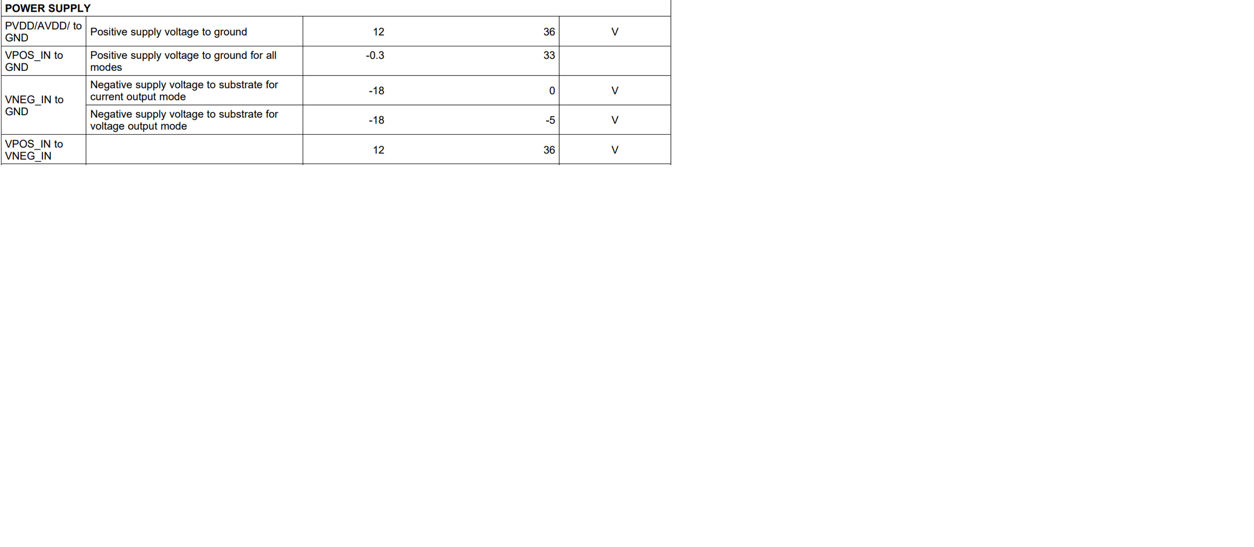 您好,参考下面电气参数表格,VNEG_IN的电压范围,电流输出模式的时候为-18V~0V,电压输出模式的时候为-18V~-5V. 所以电压模式输出的话,即使只输出正电压,也需要在-18V~-5V之间。 如果电流输出模式的话,可以接地。 另外还要注意VPOS_IN 和VNEG_IN的压差在12V~36V之间。