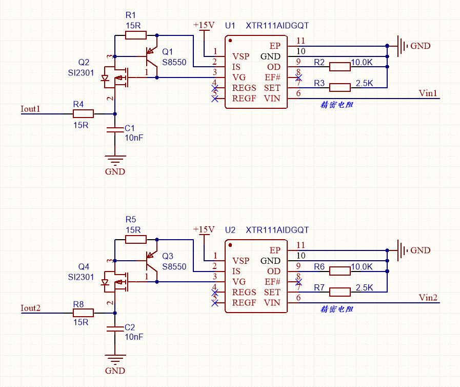 请大家帮忙分析一下,这个电路XTR111为啥不能正常工作,直接用电流表测试电流很大,达到45mA,而且接负载电流会变小,如接120欧姆,电流会变成25mA,这根本就不是电流源