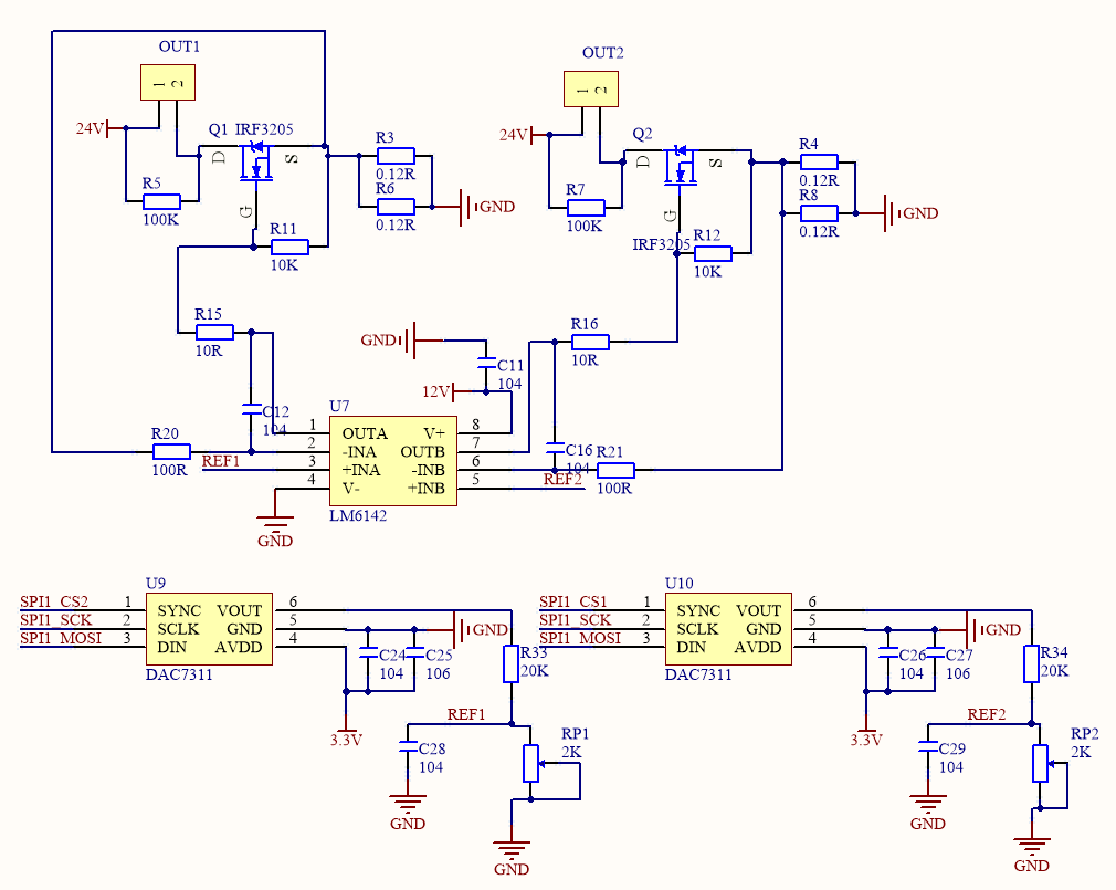 现在遇到一个问题,用DAC+运放+MOS管构成的恒流源,OUT1和OUT2接的负载为LED灯串,通过MCU控制DAC输出0时发现,有部分通道无法输出0A,通过更换相同型号,相同批次的LM6142可以改善一些,但还是会有出现,所以想知道是什么原因导致的?是运放那部分参数影响的结果?有什么改善的方法?