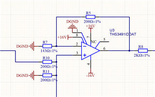 同样采用ths3491作为驱动电路,Vin+端有分压电路,输出达不到最大电压正负16V。