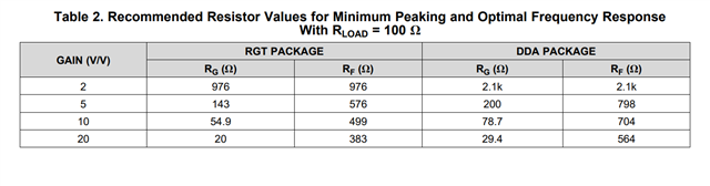 另外,这是一款电流反馈运放,为了保证运放能正常工作,反馈电阻Rf和输入电压Rg建议参考datasheet中推荐值: