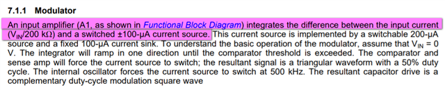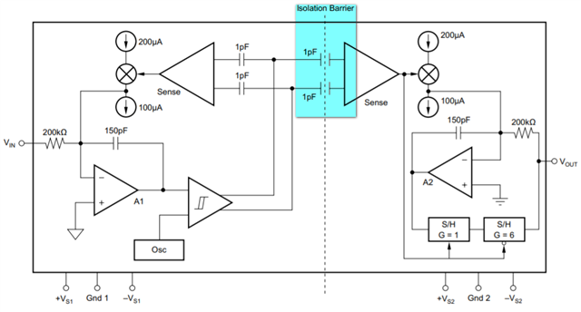 仔细看了下ISO124工作原理,ISO124对输入信号的隔离,需要对输入信号进行调制才能通过这个1pF的Isolation Barrier,如下datasheet截图。输入放大器A1对输入电流和 ±100µA Ω 电流源之间的差值进行积分(An input amplifier integrates the difference between the input current and a switched 100µA current source. )