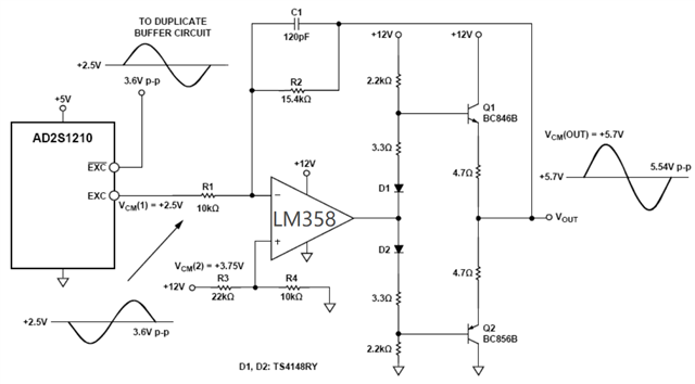 如上图所示,AD2S1210的输出EXC接运放前置功率放大电路,目的是放大信号的幅值,同时提高输出功率。请教一下,该电路具体的工作原理是什么?为什么把VOUT反馈到反相输入端可以构成负反馈?负反馈指的不是应该把运放的输出反馈到反相输入端吗?谢谢