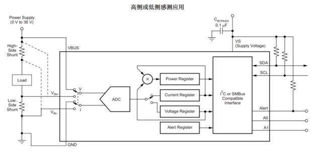 也就是说您要测电源输入至隔离电源模块的电压和电流?这里的“隔离电源模块”应该是相当于如下INA226应用框图中的load,INA226可在 0V ~ 36V 的共模总线电压范围内感测电流,“输入的电压差是30V”是指您的应用中共模电压为30V吗?这样的话是可以的。