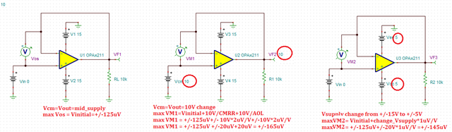 输入失调电压受PSRR、CMRR、Aol、输入失调电流以及相应的温漂参数的影响,下面图片给出了PSRR、CMRR、Aol对输入失调电压的影响示例: