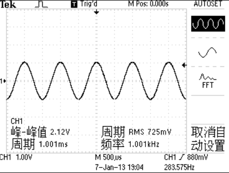 先说正弦波 :图1是输入1KHZ 时LM358的输出 幅值是-1V~1V 效果还是比较好的。