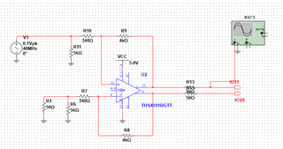 利用THS4511做一个全差分放大,原理图如下 ,50Ω单端输入,+5V电压接5,6,7,8引脚,13,14,15,16引脚接地,VCOM端悬空,PD端悬空,在输出用10MΩ示波器探头进行测试,输出共模电压不在2.5V,输出的两个引脚共模电压是6V,而且不能起到放大效果,是PD脚不能悬空的问题吗?