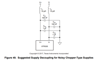 XTR305内部OPA的PSRR典型值为+/-0.2uV/V(最大为+/-10uV/V)。IA(仪表放大器)也具有+/-0.8uV/V(和+/-10uV/V最大值)的类似PSRR。