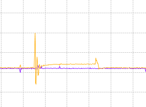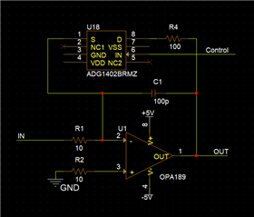 实验中设计了一个积分电路用于积分百纳秒级的脉冲信号。其中与积分电容并联的是一个模拟开关及一个串联的电阻,通过Control信号控制模拟开关的通断,以切换积分状态或者使积分电容放电。测试中发现一个问题,在输入为0或者直接接地的时候,如果断开模拟开关使电路进入积分状态,会有一个200mV左右的输出,其信号宽度与模拟开关断开时间相同,如图