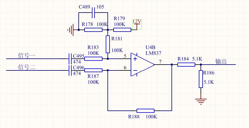 你这里的R178、R179如果是用来分压的和R181没有太大关系。R181才是真正加法器的系数 R183/(R183+R181) 和 R181/(R183+R181)