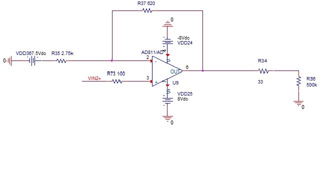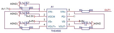 原理图中Vs供电为±6V,OUT1输入范围是1.7~4.9V,VOCM=0.9V, 放大器的负极输入为1.7V,放大倍数RF/RG=500/800=0.625.